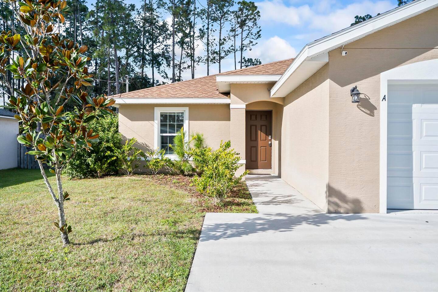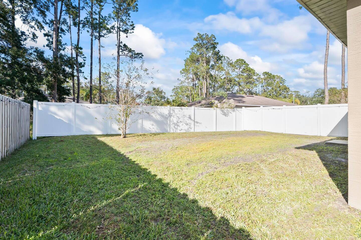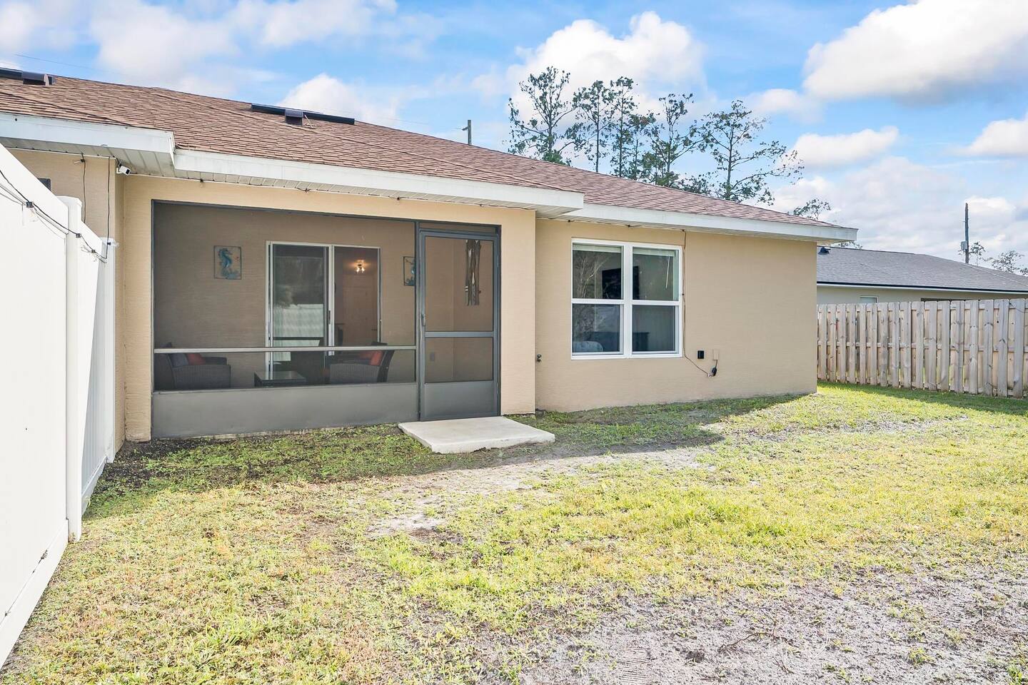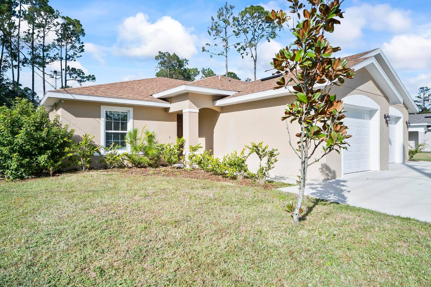 Step out from your private entrance and you'll be greeted by the cypress and palm trees located in one of the Palm Coast quite, beautiful neighborhood. What our guests love about our listing: - Our house has Three Bedrooms! - Dining table for 6! - Screened patio on the back easily sits 4 people in arm chairs and a table! - Professionally cleaned and sanitized between each and every guest. We OBSESS over cleanliness and ensure all surfaces have been thoroughly washed and sanitized with disinfectant wipes and all linens and towels are bleached. - Only a 4 min Drive to Pine Lakes Golf Club and a 15 min Drive to ocean! - Beautifully decorated space with a modern theme decorated by a local Palm Coast interior designer! - Easy self-check-in via. secure door keypad. - One car garage, multiple car parking and free street parking. - Fast Fiberoptic Wi-Fi for delay free connections - Large 65" Smart TV in the living room and 50" Smart TVs in two of three bedrooms, which feature complimentary Netflix. - Walk in closet in master bedroom. - Stand up working desk with ergonomic chair. - Iron and Ironing board, hair dryer. - Washer and dryer located in garage. - Located with easy access to anywhere in the city Whether you just want to relax on your plush king bed, read a book by the large windows or patio, take a nap on the couch or get some work done at the desk, this house has everything you need to enjoy your visit. Our guest suite comfortably sleeps 8 with 2 king size, 2 TwinXL size beds, and a queen pullout couch in the living room - all beds complete with fresh sheets changed after every single guest. Our master bedroom also has a full sparkling clean bathroom with shower, sink and toilet. The other sparkling clean bathroom has a bathtub with shower, sink and toilet. Everyone can get ready for their day quickly! Complimentary Wi-Fi, Netflix and coffee. Your kitchen comes fully loaded with brand new appliances such as a microwave, air-fryer, pressure cooker, fridge, electric stove and dishwasher along with glasses, mugs, dishes, and cutlery. Once you stay with us, you'll feel like you're simply staying at a home you own!