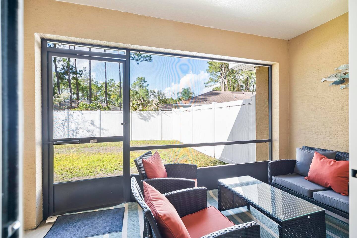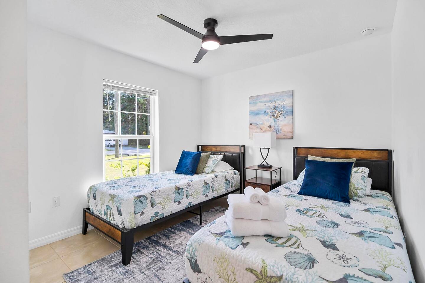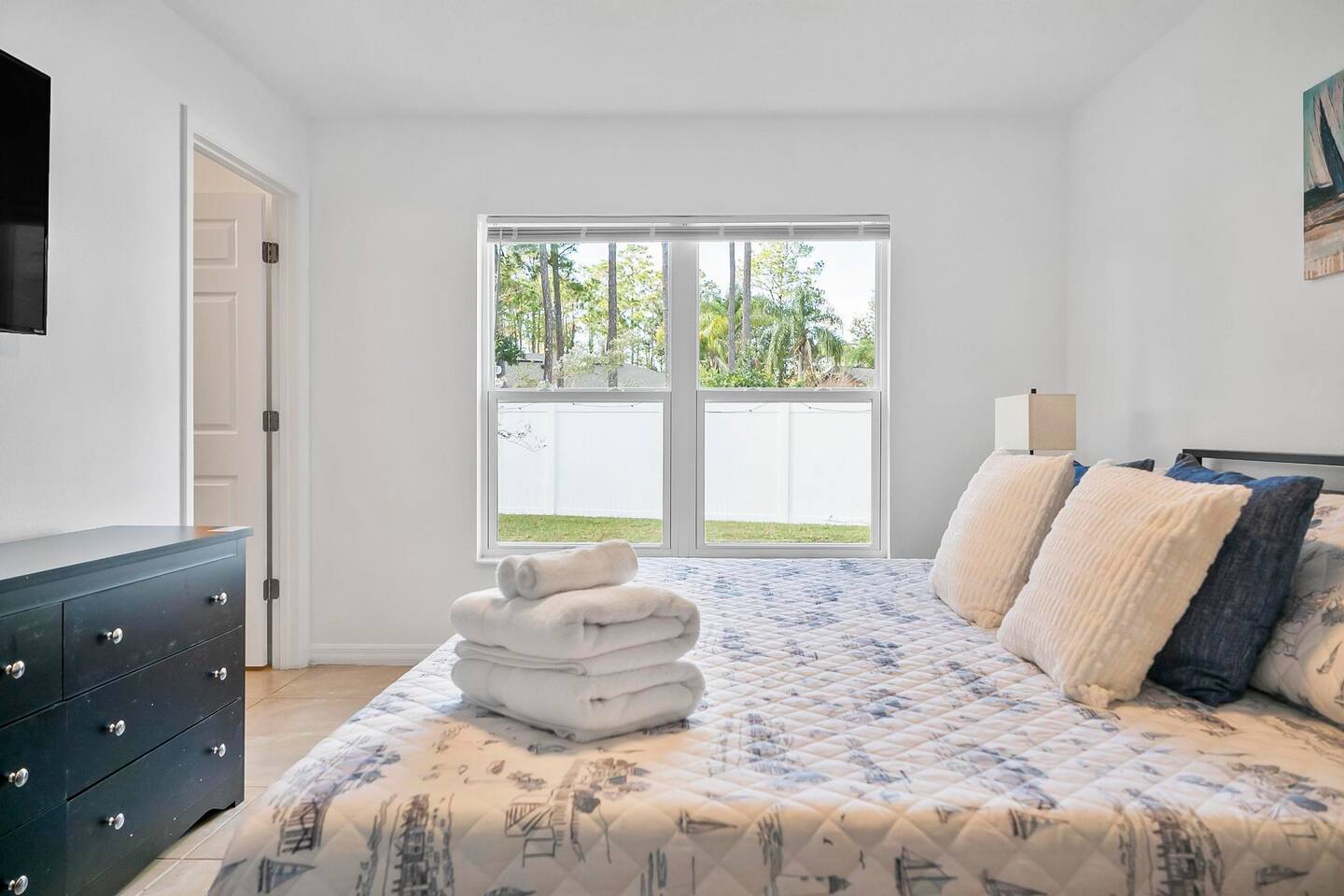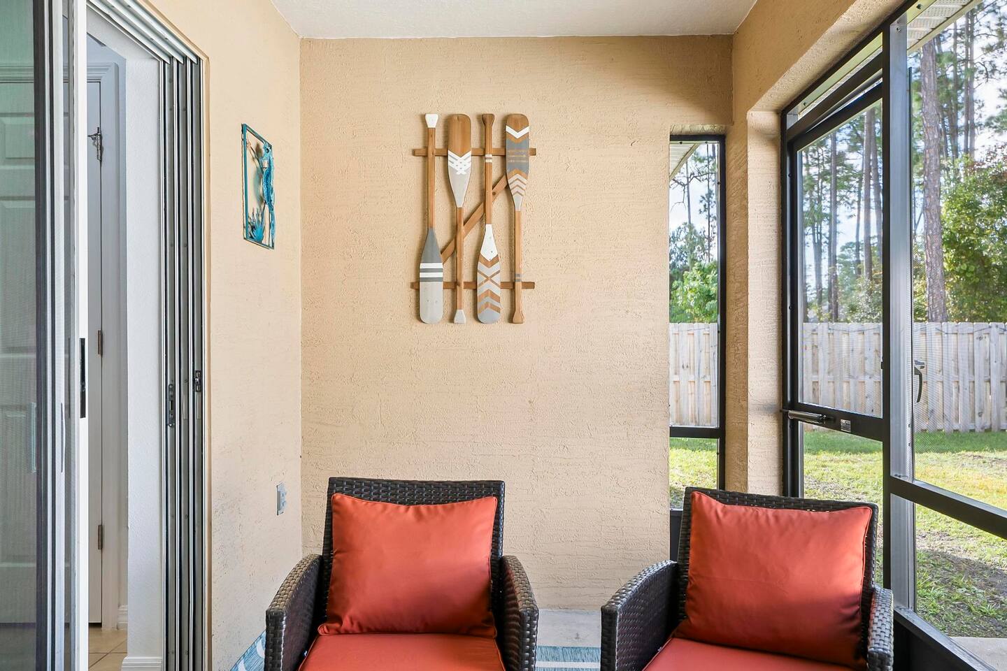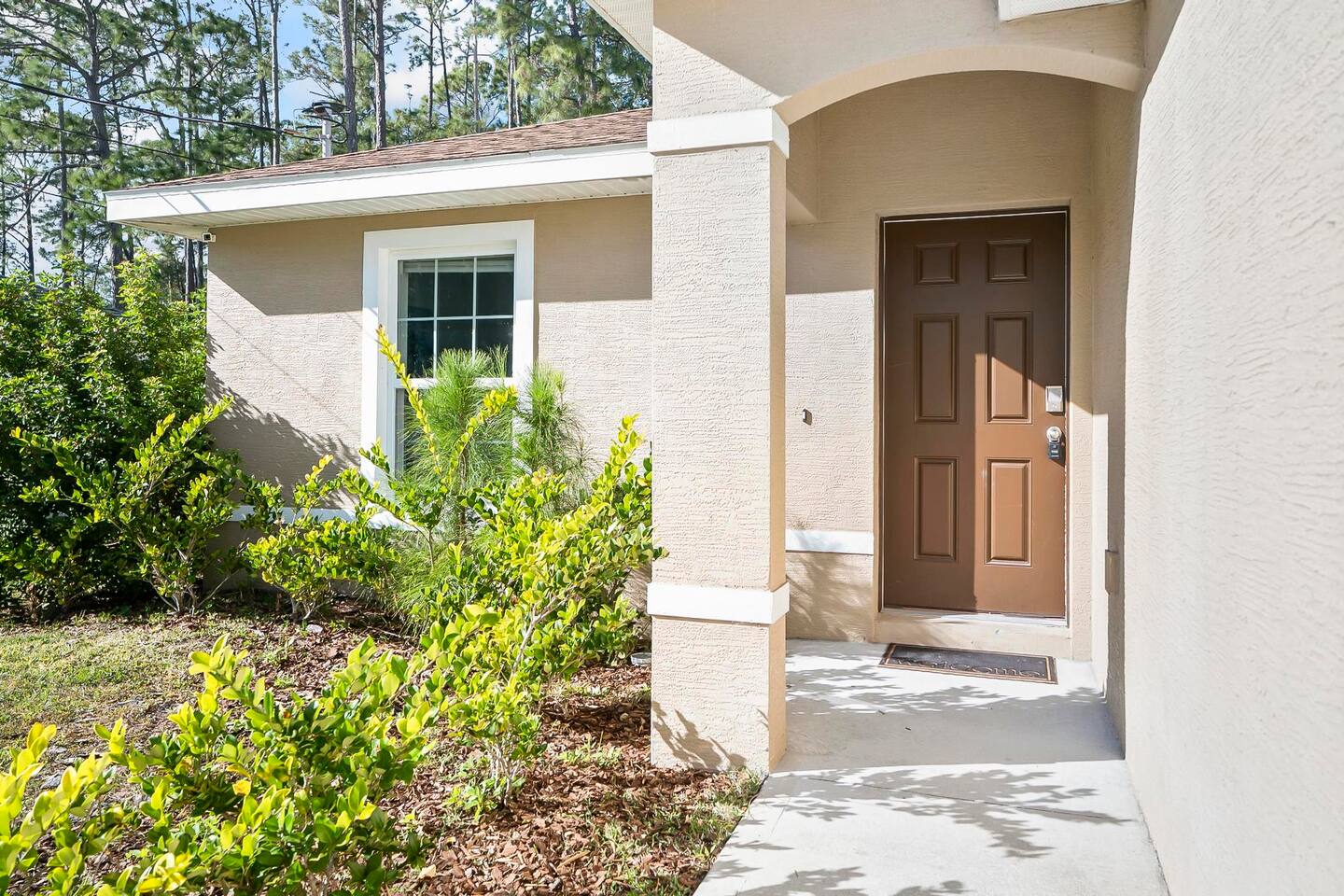 Step out from your private entrance and you'll be greeted by the cypress and palm trees located in one of the Palm Coast quite, beautiful neighborhood. What our guests love about our listing: - Our house has Three Bedrooms! - Dining table for 6! - Screened patio on the back easily sits 4 people in arm chairs and a table! - Professionally cleaned and sanitized between each and every guest. We OBSESS over cleanliness and ensure all surfaces have been thoroughly washed and sanitized with disinfectant wipes and all linens and towels are bleached. - Only a 4 min Drive to Pine Lakes Golf Club and a 15 min Drive to ocean! - Beautifully decorated space with a modern theme decorated by a local Palm Coast interior designer! - Easy self-check-in via. secure door keypad. - One car garage, multiple car parking and free street parking. - Fast Fiberoptic Wi-Fi for delay free connections - Large 65" Smart TV in the living room and 50" Smart TVs in two of three bedrooms, which feature complimentary Netflix. - Walk in closet in master bedroom. - Stand up working desk with ergonomic chair. - Iron and Ironing board, hair dryer. - Washer and dryer located in garage. - Located with easy access to anywhere in the city Whether you just want to relax on your plush king bed, read a book by the large windows or patio, take a nap on the couch or get some work done at the desk, this house has everything you need to enjoy your visit. Our guest suite comfortably sleeps 8 with 2 king size, 2 TwinXL size beds, and a queen pullout couch in the living room - all beds complete with fresh sheets changed after every single guest. Our master bedroom also has a full sparkling clean bathroom with shower, sink and toilet. The other sparkling clean bathroom has a bathtub with shower, sink and toilet. Everyone can get ready for their day quickly! Complimentary Wi-Fi, Netflix and coffee. Your kitchen comes fully loaded with brand new appliances such as a microwave, air-fryer, pressure cooker, fridge, electric stove and dishwasher along with glasses, mugs, dishes, and cutlery. Once you stay with us, you'll feel like you're simply staying at a home you own!