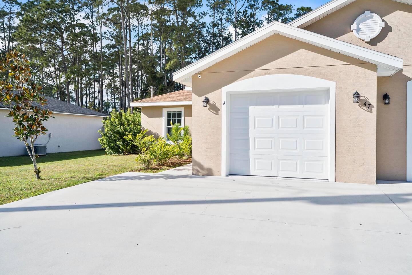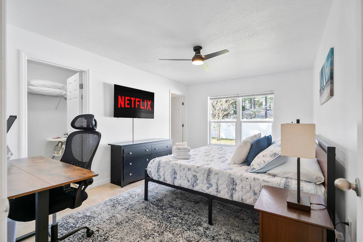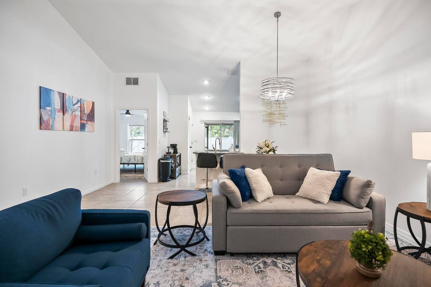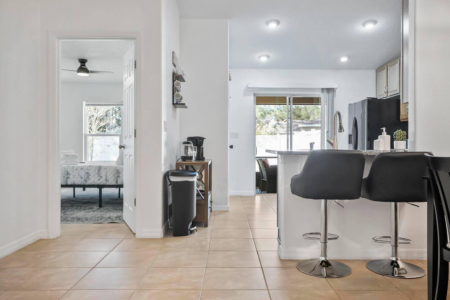 Step out from your private entrance and you'll be greeted by the cypress and palm trees located in one of the Palm Coast quite, beautiful neighborhood. What our guests love about our listing: - Our house has Three Bedrooms! - Dining table for 6! - Screened patio on the back easily sits 4 people in arm chairs and a table! - Professionally cleaned and sanitized between each and every guest. We OBSESS over cleanliness and ensure all surfaces have been thoroughly washed and sanitized with disinfectant wipes and all linens and towels are bleached. - Only a 4 min Drive to Pine Lakes Golf Club and a 15 min Drive to ocean! - Beautifully decorated space with a modern theme decorated by a local Palm Coast interior designer! - Easy self-check-in via. secure door keypad. - One car garage, multiple car parking and free street parking. - Fast Fiberoptic Wi-Fi for delay free connections - Large 65" Smart TV in the living room and 50" Smart TVs in two of three bedrooms, which feature complimentary Netflix. - Walk in closet in master bedroom. - Stand up working desk with ergonomic chair. - Iron and Ironing board, hair dryer. - Washer and dryer located in garage. - Located with easy access to anywhere in the city Whether you just want to relax on your plush king bed, read a book by the large windows or patio, take a nap on the couch or get some work done at the desk, this house has everything you need to enjoy your visit. Our guest suite comfortably sleeps 8 with 2 king size, 2 TwinXL size beds, and a queen pullout couch in the living room - all beds complete with fresh sheets changed after every single guest. Our master bedroom also has a full sparkling clean bathroom with shower, sink and toilet. The other sparkling clean bathroom has a bathtub with shower, sink and toilet. Everyone can get ready for their day quickly! Complimentary Wi-Fi, Netflix and coffee. Your kitchen comes fully loaded with brand new appliances such as a microwave, air-fryer, pressure cooker, fridge, electric stove and dishwasher along with glasses, mugs, dishes, and cutlery. Once you stay with us, you'll feel like you're simply staying at a home you own!