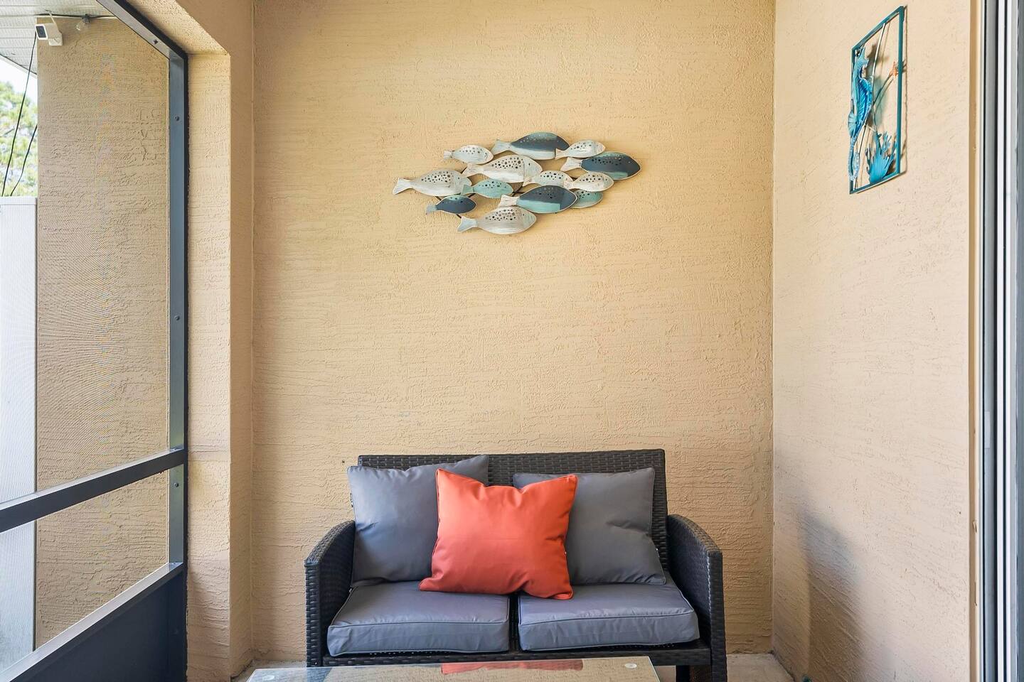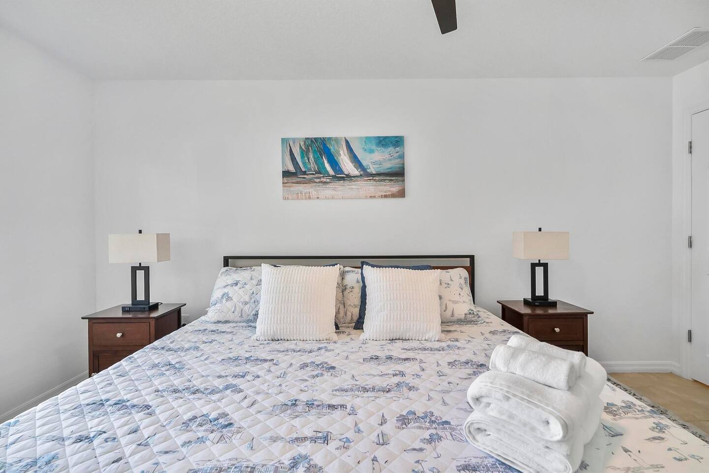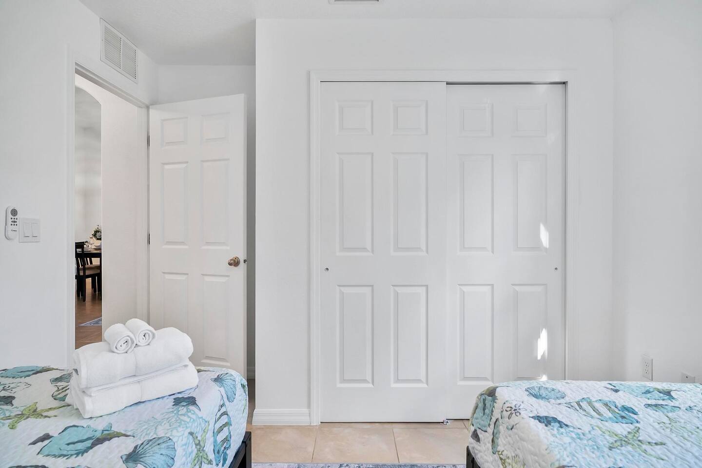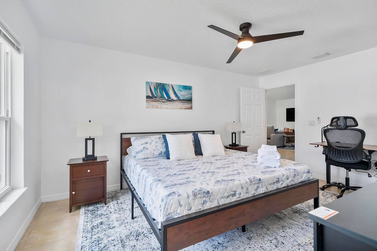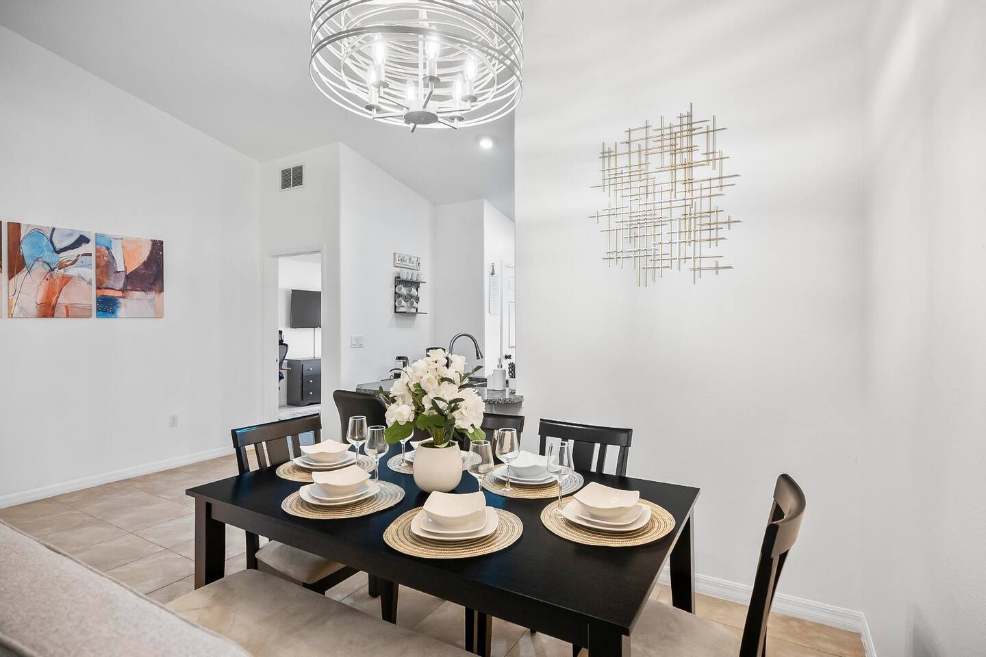 Step out from your private entrance and you'll be greeted by the cypress and palm trees located in one of the Palm Coast quite, beautiful neighborhood. What our guests love about our listing: - Our house has Three Bedrooms! - Dining table for 6! - Screened patio on the back easily sits 4 people in arm chairs and a table! - Professionally cleaned and sanitized between each and every guest. We OBSESS over cleanliness and ensure all surfaces have been thoroughly washed and sanitized with disinfectant wipes and all linens and towels are bleached. - Only a 4 min Drive to Pine Lakes Golf Club and a 15 min Drive to ocean! - Beautifully decorated space with a modern theme decorated by a local Palm Coast interior designer! - Easy self-check-in via. secure door keypad. - One car garage, multiple car parking and free street parking. - Fast Fiberoptic Wi-Fi for delay free connections - Large 65" Smart TV in the living room and 50" Smart TVs in two of three bedrooms, which feature complimentary Netflix. - Walk in closet in master bedroom. - Stand up working desk with ergonomic chair. - Iron and Ironing board, hair dryer. - Washer and dryer located in garage. - Located with easy access to anywhere in the city Whether you just want to relax on your plush king bed, read a book by the large windows or patio, take a nap on the couch or get some work done at the desk, this house has everything you need to enjoy your visit. Our guest suite comfortably sleeps 8 with 2 king size, 2 TwinXL size beds, and a queen pullout couch in the living room - all beds complete with fresh sheets changed after every single guest. Our master bedroom also has a full sparkling clean bathroom with shower, sink and toilet. The other sparkling clean bathroom has a bathtub with shower, sink and toilet. Everyone can get ready for their day quickly! Complimentary Wi-Fi, Netflix and coffee. Your kitchen comes fully loaded with brand new appliances such as a microwave, air-fryer, pressure cooker, fridge, electric stove and dishwasher along with glasses, mugs, dishes, and cutlery. Once you stay with us, you'll feel like you're simply staying at a home you own!